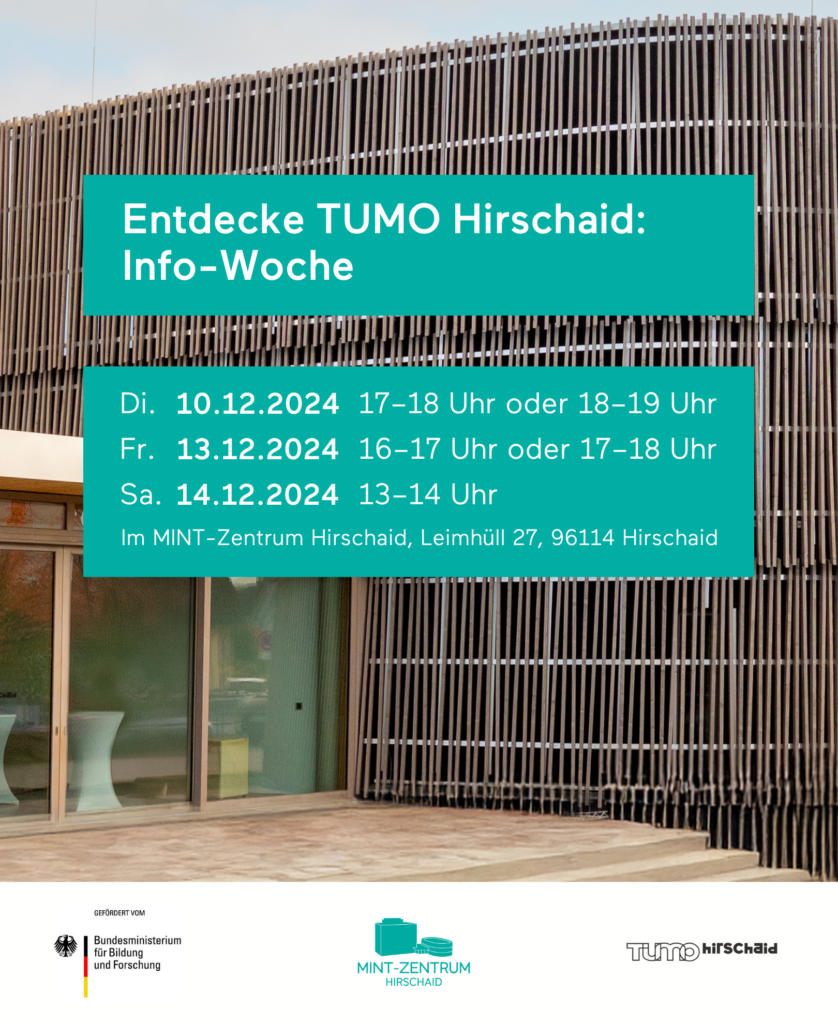 Für Jugendliche, Eltern & alle Interessierte: Einblick in Kurse, kreative Technologien & Zukunftsmöglichkeiten. Diese Veranstaltung richtet sich an alle Jugendlichen im Alter von 12 bis 18 Jahren und ihre Eltern / Erziehungsberechtigten, die mehr über das internationale und innovative Lernkonzept im neuen MINT-Zentrum Hirschaid erfahren möchten. Wir gewähren Einblicke, wie TUMO junge Menschen durch kreative […]